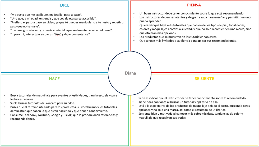 Se llevó a cabo una investigación enfocada en personas que disfrutan o están interesadas en el maquillaje. Este estudio se clasificó como investigación primaria y cualitativa, ya que decidí realizar entrevistas individuales con cada usuario para comprender sus necesidades y preferencias en mayor profundidad. Durante este proceso, también utilicé mapas de empatía para visualizar y analizar mejor las emociones, pensamientos y comportamientos de los participantes.
